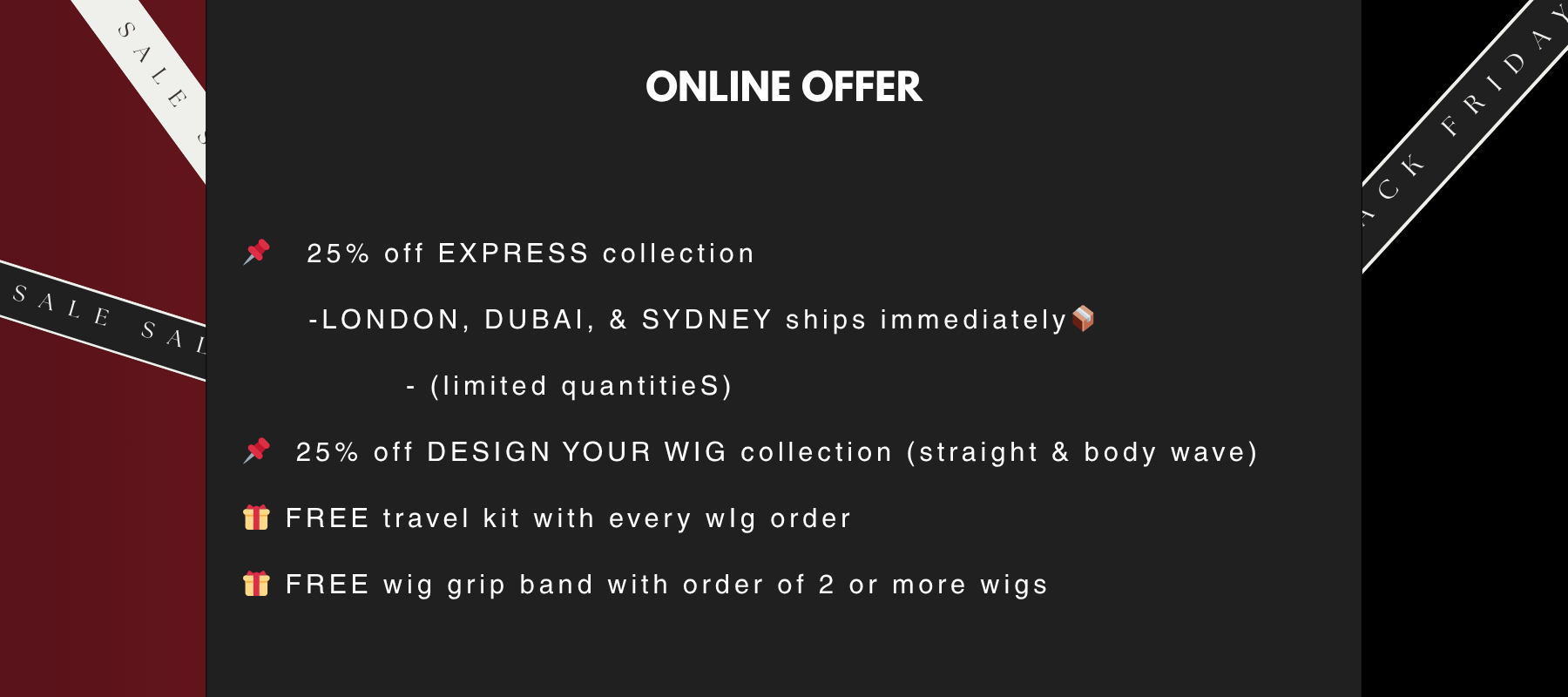 We do not offer rush service during Black Friday or Cyber Monday due to high order volume. If you need a wig quickly, we recommend shopping the Express Collection, which includes ready-to-ship styles.